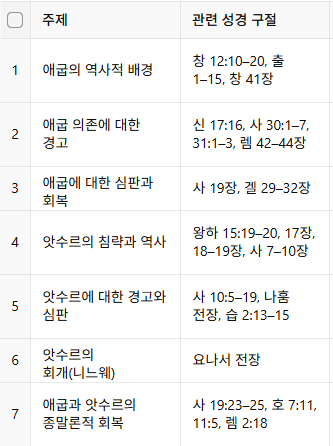 애굽(이집트)과 앗수르(Assyria)에 대해 공부할 때, 이 두 나라가 등장하거나 관련된 역사적, 예언적, 신학적 내용을 포함하는 성경 본문들을 함께 참고하면 이해가 훨씬 깊어집니다. 아래는 주제별로 구분하여 함께 보면 좋은 성경 구절들을 정리한 목록입니다.